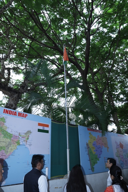 Flag hoisting was done by Chief Guests Mr. & Mrs. Chetan Bora, with Guest of Honour Mr. Pratap Madhukar Jadhav, Mr. Narendra Joshi, and Mr. Pravin Netavne in attendance.